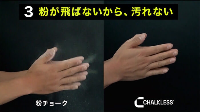 従来のチョークや粉末状の滑り止めに比べて圧倒的に粉が飛びにくく、手や衣服が汚れにくいです。