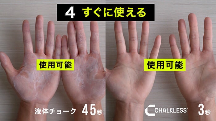 液体チョークのように乾くまで、待つ必要がありません。チョークレスは手につけた瞬間から効果を最大限発揮します。チョークレスはパウダー形状のため、つけ心地は驚くほどサラサラです